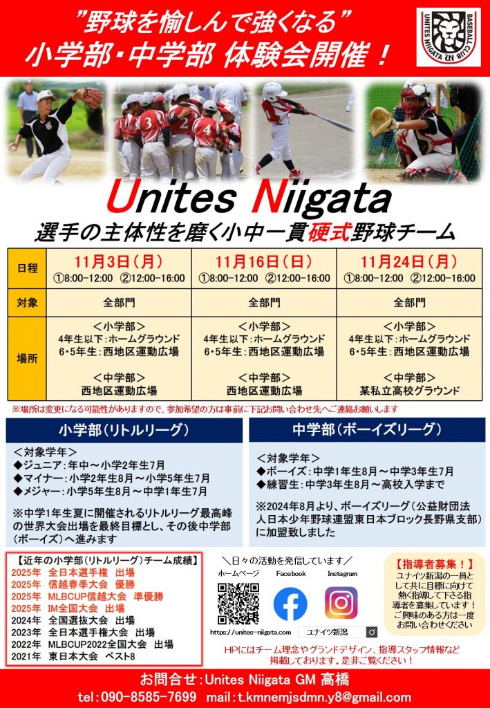 Unites Niigataは県内唯一の小中一貫硬式野球チームとして、経験豊富な指導スタッフが各部門ごとに丁寧に指導し、野球の技術だけでなく、野球を通じて人間力を高める応援をしております。